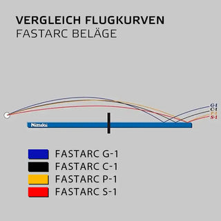 The Fastarc G-1 plays a little harder than its colleague, the Fastarc C-1. Both rubbers have the same surface rubber. However, the Fastarc G-1 has a slightly harder sponge and therefore plays harder than the C-1. The Fastarc G-1 has the highest flight curve of all Fastarc rubbers.